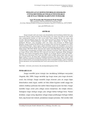 Agus, Wuryanta and Pranatasari, Dyah Susanti (2014) Pemanfaatan sistem informasi geografis untuk identifikasi tingkat pencemaran air sungai Wiroko Kabupaten Wonogiri. In: Prosiding Pertemuan Ilmiah Tahunan Ke-I, Masyarakat Limnologi Indonesia, 3 Desember 2013, Cibinong.
