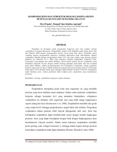 Penelitian ini bertujuan untuk mengetahui komposisi jenis dan struktur ekologi zooplankton di Sungai Banyuasin. Pengambilan sampel telah dilakukan pada bulan April, Juni dan Oktober 2009 dengan menggunakan metode survei pada lima lokasi. Pemilihan lokasi sampling dengan menggunakan purposive sampling didasarkan pada mikrohabitat. Sampel zooplankton diambil dengan menggunakan ember 10 L dan total volume yang disaring dengan plankton net sebanyak 50 L. Data yang dianalisa meliputi kelimpahan, komposisi jenis, keragaman, keseragaman dan indeks dominasi. Hasil analisa jumlah spesies zooplankton yang ditemukan sebanyak 18 jenis dengan jumlah tertinggi dijumpai pada bulan Juni dan terendah pada bulan Oktober. Indeks keanekaragaman dan kelimpahan zooplankton selama penelitian berkisar antara 0,6-1.8 dan 2-19ind/l. Indeks keseragaman bervariasi dengan nilai 0.73-0.82 pada bulan April, 0.78-1.00 pada bulan Juni sedangkan bulan Oktober berkisar 0.36-0.93. Selanjutnya untuk dominasi jenis, selama penelitian tidak terdapat jenis zooplankton yang mendominasi perairan.