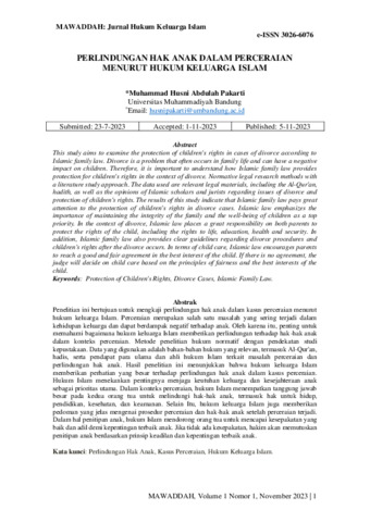 Muhammad, Husni Abdulah (2023) Perlindungan hak anak dalam perceraian menurut hukum keluarga Islam. Mawaddah: Jurnal Hukum Keluarga Islam, 1 (1): 1. pp. 1-13. ISSN 3031-5247