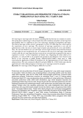 Iffah, Fathiah (2023) Itsbat nikah poligami perspektif Undang-Undang Perkawinan dan SEMA No. 3 tahun 2018. Mawaddah: Jurnal Hukum Keluarga Islam, 1 (1): 2. pp. 14-38. ISSN 3031-5247