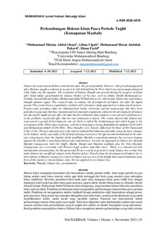 Muhammad, Maisan Abdul Ghani and Ghina, Ulpah and Muhammad, Husni Abdulah Pakarti and Diana, Farid (2023) Perkembangan hukum Islam pasca periode taqlid (kemapanan mazhab). Mawaddah: Jurnal Hukum Keluarga Islam, 1 (1): 5. pp. 58-73. ISSN 3031-5247