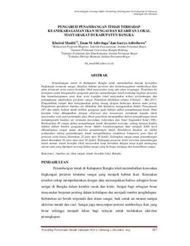 Penambangan timah di Kabupaten Bangka telah menimbulkan banyak kerusakan lingkungan termasuk sungai. Kualitas habitat perairan dan keanekaragaman sumberdaya ikan akan terancam serta sistem kearifan lokal masyarakat yang ada akan terganggu. Penelitian ini bertujuan untuk menganalisis pengaruh aktivitas penambangan timah terhadap kualitas perairan dan keanekaragaman jenis ikan serta kearifan lokal masyarakat terkait perlindungan dan pemanfaatan sumberdaya perairan sungai. Penelitian dilakukan selama Februari – Mei 2013. Pengambilan sampel ikan menggunakan jaring insang dengan beberapa ukuran mata jaring. Pengukuran parameter kualitas air dilakukan dan dianalisis menggunakan Indeks Pencemaran (IP) dan indeks habitat untuk melihat gangguan pada habitat akibat penambangan timah. Data kearifan lokal dikumpulkan dengan observasi dan wawancara mendalam kepada tokoh masyarakat serta para pemangku adat. Hasil penelitian menunjukkan bahwa penambangan timah mempengaruhi kualitas air terutama kecerahan, kekeruhan dan Total Suspended Solid (TSS). Berdasarkan IP sungai akibat penambangan timah dinyatakan tercemar sedang dengan kondisi habitat dalam kondisi gangguan berat. Indeks keanekaragaman ikan menjadi lebih kecil dibandingkan sungai tanpa aktivitas penambangan timah. Rendahnya kualitas air akibat sedimentasi tailing penambangan timah mengakibatkan rendahnya komposisi jenis ikan di perairan yaitu hanya ditemukan 22 jenis dari 10 famili. Sedangkan sungai tanpa penambangan timah ditemukan 36 jenis ikan dari 16 famili. Walaupun perairan telah tercemar penambangan timah namun sistem kearifan lokal masyarakat tetap bertahan dengan tetap teguh memegang aturan adat yang dipimpin seorang dukun sungai yang bertugas menjaga dan memelihara sungai.