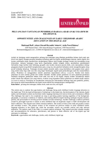 Rakhmad, Rafi and Adam, Ghozali Reynaldo Suharto and Aulia, Nurul Rahma (2023) Peluang dan tantangan pendidikan bahasa Arab anak usia dini di era digital. Lentera Paud: Islamic Education and Counseling Journal, 2 (1): 1. ISSN 2964-5832