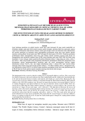 Rakhmad, Rafi and Astuti, Astuti (2023) Efektifitas penggunaan metode read aloud untuk meningkatkan kemampuan critical thinking dalam aspek perkembangan bahasa di TK IT Zaid Bin Tsabit. Lentera Paud: Islamic Education and Counseling Journal, 2 (1): 3. ISSN 2964-5832