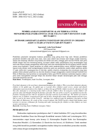 Suparmiati, Suparmiati and Aulia, Nurul Rahma (2023) Pembelajaran loosepart di alam terbuka untuk mengembangkan kreativitas anak usia 5-6 tahun di PAUD IT Zaid Bin Tsabit 3. Lentera Paud: Islamic Education and Counseling Journal, 2 (1): 6. ISSN 2964-5832
