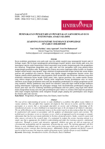 Kasus rendahnya pemahaman sains pada anak usia dini adalah masalah yang memengaruhi banyak anak di berbagai negara. Hal Ini dapat mempengaruhi perkembangan kognitif mereka, minat mereka pada sains, dan kemampuan mereka untuk berpartisipasi dalam masyarakat yang semakin bergantung pada ilmu pengetahuan dan teknologi. Pengetahuan pengenalan sains pada anak usia dini merupakan topik yang penting dalam pengembangan pendidikan anak. Penggunaan Eco Enzym atau enzim lingkungan dalam konteks ini mungkin menjadi sebuah metode yang menarik, tetapi sebaiknya diimplementasikan dengan berhati-hati sesuai dengan panduan ahli pendidikan dan ilmuwan. Metode yang dipakai dengan menggunakan literatur review atau tinjauan pustaka adalah pendekatan yang digunakan untuk menyelidiki atau menyusun informasi yang telah diterbitkan sebelumnya dalam bentuk artikel jurnal, buku, laporan penelitian, dan sumber-sumber lainnya yang relevan dengan topik penelitian. Penting untuk menjelaskan konsep pembelajaran sains ini secara sederhana sesuai dengan pemahaman anak-anak dan menjadikan pembelajaran ini sebagai pengalaman positif yang mendidik. Melalui pendekatan yang kreatif dan interaktif, anak-anak dapat tumbuh dengan kesadaran tentang keberlanjutan lingkungan dan pentingnya menjaga bumi kita.Pendekatan pembelajaran dengan Eco Enzym pada anak usia dini cenderung melibatkan pembelajaran aktif dan praktis, yang dapat lebih efektif dalam mengenalkan konsep sains dari pada pembelajaran pasif. Selain itu, evaluasi lebih lanjut dan penelitian lebih lanjut mungkin diperlukan untuk mengukur dampak jangka panjang dari pembelajaran sains dengan Eco Enzym pada anak usia dini.