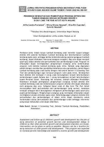 Alifia, Candra Puriastuti and Winny, Kirana Hasanah and Nina, Rini Suprobo and Zumroh, Hasanah (2024) Pendidikan kesehatan dan pembentukan program deteksi dini tumbuh kembang dengan instrumen denver II di Day Care The Puri Astuti Kota Malang. Jurnal Kreativitas Pengabdian kepada Masyarakat, 7 (3): 5. pp. 988-1001. ISSN 2615-0921