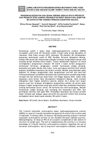 Winny, Kirana Hasanah and Zumroh, Hasanah and Alifia, Candra Puriastuti and Dessy, Amelia and Putri, Nurika Dewi and Arya, Kusuma Dani (2024) Pendidikan kesehatan dan senam aerobik sebagai upaya preventif dan promotif efek samping peningkatan berat badan pada akseptor KB suntik di PMB Viandika Permana Kabupaten Malang. Jurnal Kreativitas Pengabdian kepada Masyarakat, 7 (3): 6. pp. 1002-1014. ISSN 2615-0921