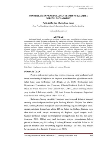 Naila, Zulfia and Chairulwan, Umar (2014) Kondisi lingkungan perairan di Embung Klamalu Sorong Papua Barat. In: Prosiding Pertemuan Ilmiah Tahunan Ke-I, Masyarakat Limnologi Indonesia, 3 Desember 2013, Cibinong.