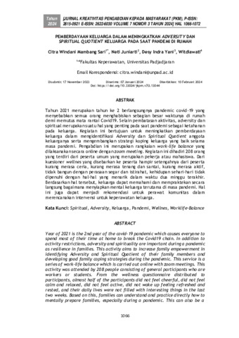 Citra, Windani Mambang Sari and Neti, Juniarti and Desy, Indra Yani and Witdiawati, Witdiawati (2024) Pemberdayaan keluarga dalam meningkatkan adversity dan spiritual quotient keluarga pada saat pandemi di rumah. Jurnal Kreativitas Pengabdian kepada Masyarakat, 7 (3): 12. pp. 1066-1072. ISSN 2615-0921