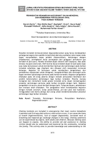 Darwin, Karim and Wan, Nishfa Dewi and Bayhakki, Bayhakki and Erwina, Erwina and Nurul, Huda and Rismadefi, Woferst and Adila, Azzahra and Selly, Anjely and Zahra, Hunafa and Muhammad, Farhan Aswan (2024) Peningkatan kemampuan masyarakat dalam mengenal dan memberikan pertolongan awal pada korban tersedak. Jurnal Kreativitas Pengabdian kepada Masyarakat, 7 (3): 13. pp. 1073-1082. ISSN 2615-0921