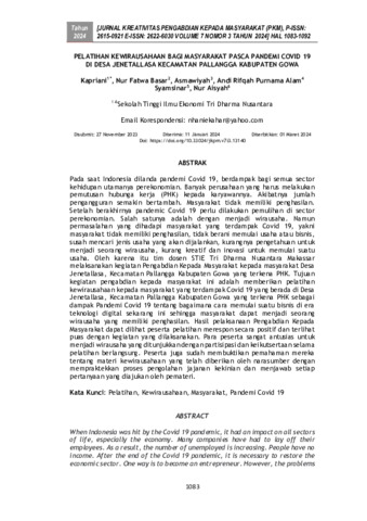 Kapriani, Kapriani and Nur, Fatwa Basar and Asmawiyah, Asmawiyah and Andi, Rifqah Purnama Alam and Syamsinar, Syamsinar and Nur, Aisyah (2024) Pelatihan kewirausahaan bagi masyarakat pasca pandemi Covid 19 di Desa Jenetallasa Kecamatan Pallangga Kabupaten Gowa. Jurnal Kreativitas Pengabdian kepada Masyarakat, 7 (3): 14. pp. 1083-1092. ISSN 2615-0921