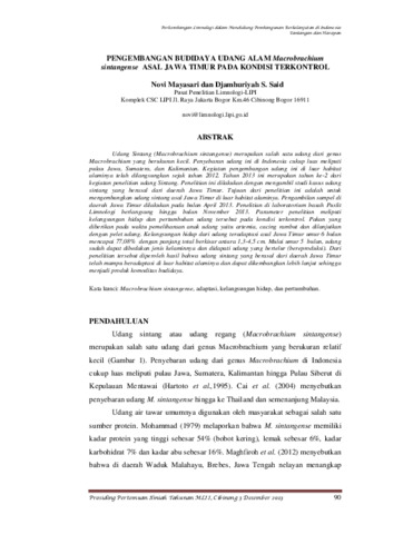 Novi, Mayasari and Djamhuriyah, S. Said (2014) Pengembangan budidaya udang alam Macrobrachium sintangense asal Jawa Timur pada kondisi terkontrol. In: Prosiding Pertemuan Ilmiah Tahunan Ke-I, Masyarakat Limnologi Indonesia, 3 Desember 2013, Cibinong.