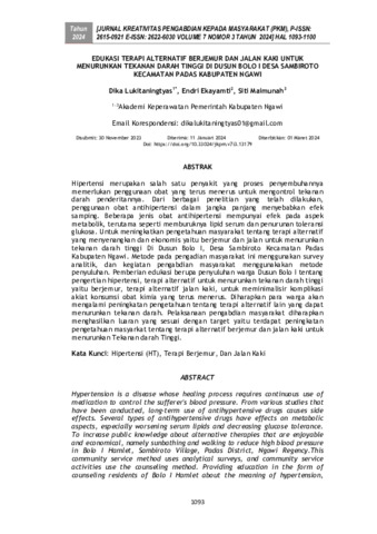 Dika, Lukitaningtyas and Endri, Ekayamti and Siti, Maimunah (2024) Edukasi terapi alternatif berjemur dan jalan kaki untuk menurunkan tekanan darah tinggi di Dusun Bolo I Desa Sambiroto Kecamatan Padas Kabupaten Ngawi. Jurnal Kreativitas Pengabdian kepada Masyarakat, 7 (3): 15. pp. 1093-1100. ISSN 2615-0921
