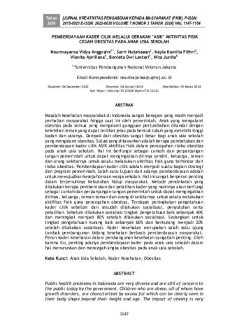 Nourmayansa, Vidya Anggraini and Serri, Hutahaean and Nayla, Kamilia Fithri and Vionita, Apriliana and Bonieta, Dwi Lestari and Nita, Junita and UNSPECIFIED (2024) Pemberdayaan kader cilik melalui gerakan "asik" aktivitas fisik cegah obesitas pada anak usia sekolah. Jurnal Kreativitas Pengabdian kepada Masyarakat, 7 (3): 21. pp. 1147-1154. ISSN 2615-0921