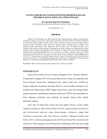 Sevi, Sawestri and Dwi, Atminarso (2014) Status trofik dan estimasi potensi produksi ikan di perairan Danau Poso, Sulawesi Tengah. In: Prosiding Pertemuan Ilmiah Tahunan Ke-I, Masyarakat Limnologi Indonesia, 3 Desember 2013, Cibinong.