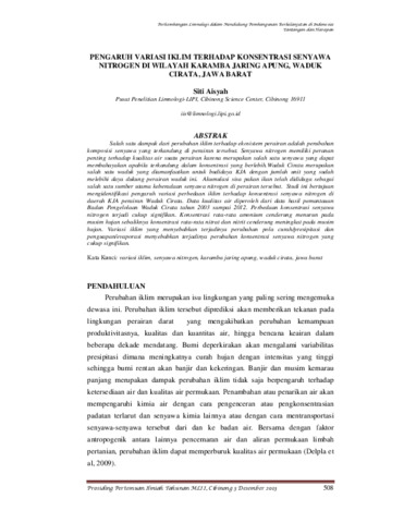 Siti, Aisyah (2014) Pengaruh variasi iklim terhadap konsentrasi senyawa nitrogen di wilayah Karamba Jaring Apung, Waduk Cirata, Jawa Barat. In: Prosiding Pertemuan Ilmiah Tahunan Ke-I, Masyarakat Limnologi Indonesia, 3 Desember 2013, Cibinong.