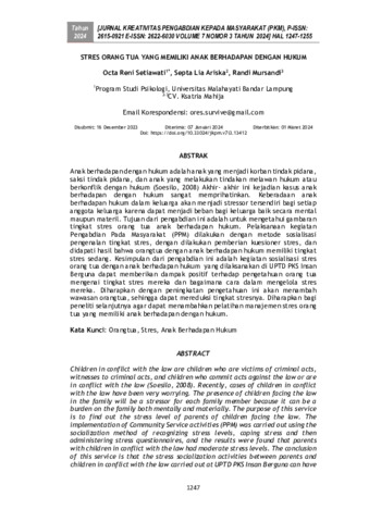 Octa, Reni Setiawati and Septa, Lia Ariska and Randi, Mursandi (2024) Mengelola stres orang tua yang memiliki anak berhadapan dengan hukum. Jurnal Kreativitas Pengabdian kepada Masyarakat, 7 (3): 30. pp. 1247-1255. ISSN 2615-0921