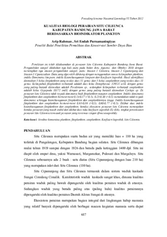 Arip, Rahman and Sri, Endah Purnamaningtyas (2012) Kualitas biologi perairan Situ Cileunca Kabupaten Bandung Jawa Barat berdasarkan bioindikator plankton. In: Prosiding Seminar Nasional Limnologi VI, 16 Juli 2012, IPB International Convention Center.