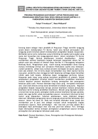 Palupi, Triwahyuni and Resa, Widiyanti (2024) Program pengabdian masyarakat untuk pencegahan dan penanganan kekutuan pada siswa Sekolah Dasar Kartika X-3 Parongpong Kabupaten Bandung Barat. Jurnal Kreativitas Pengabdian kepada Masyarakat, 7 (3): 34. pp. 1298-1313. ISSN 2615-0921
