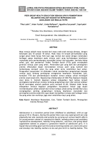 Tika, Lubis and Intan, Yusita and Linda, Rofiasari and Agustina, Suryanah and Supriyatni, Kartadarma (2024) Peer group health education sebagai upaya pembentukan kelompok inklusif kesehatan reproduksi dan manajemen gizi remaja putri. Jurnal Kreativitas Pengabdian kepada Masyarakat, 7 (3): 36. pp. 1326-1338. ISSN 2615-0921