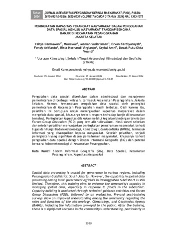 Yahya, Darmawan and Munawar, Munawar and Maman, Sudarisman and Ervan, Ferdiyansyah and Fendy, Arifianto and Rista, Hernandi Virgianto and Sayful, Amri and Desak, Putu Okta Veanti (2024) Peningkatan kapasitas perangkat masyarakat dalam pengolahan data spasial menuju masyarakat tanggap bencana banjir di Kecamatan Pesanggrahan Jakarta Selatan. Jurnal Kreativitas Pengabdian kepada Masyarakat, 7 (3): 39. pp. 1363-1375. ISSN 2615-0921