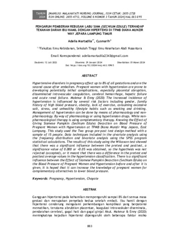 Adelia, Martadila and Cusmarih, Cusmarih (2024) Pengaruh pemberian rebusan labu siam (Sechium edule) terhadap tekanan darah ibu hamil dengan hipertensi di TPMB Diana Munzir Way Jepara Lampung Timur. Manuju: Malahayati Nursing Journal, 6 (3): 2. pp. 883-895. ISSN 2655-2728