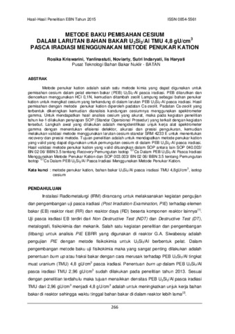 Kriswarini, Rosika and Yanlinastuti, Yanlinastuti and Noviarty, Noviarty and Indaryati, Sutri and Haryati, Iis (2015) Metode Baku Pemisahan Cesium Dalam Larutan Bahan Bakar U2Si2/Al TMU 4,8 gU/cm3 Pasca Iradiasi Menggunakan Metode Penukar Kation. Prosiding Seminar Hasil-hasil Penelitian EBN Tahun 2015, - (-). pp. 266-275. ISSN 0854-5561