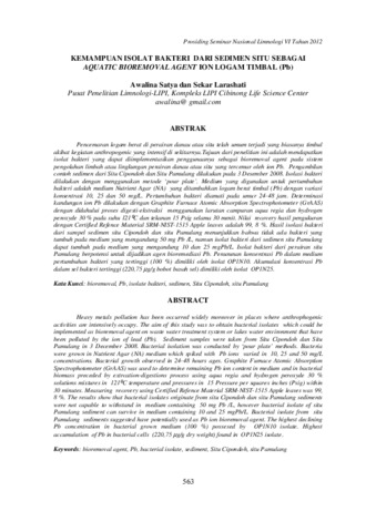 Awalina, Satya and Sekar, Larashati (2012) Kemampuan isolat bakteri dari sedimen situ sebagai aquatic bioremoval agent ion logam timbal (Pb). In: Prosiding Seminar Nasional Limnologi VI, 16 Juli 2012, IPB International Convention Center.