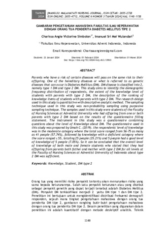 Charissa, Angie Victorine Simbolon and Imanuel, Sri Mei Wulandari (2024) Gambaran pengetahuan mahasiswa fakultas ilmu keperawatan dengan orang tua penderita diabetes mellitus tipe 2. Manuju: Malahayati Nursing Journal, 6 (3): 24. pp. 1148-1158. ISSN 2655-2728