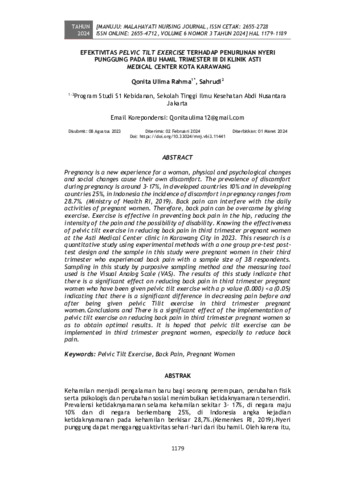 Qonita, Ulima Rahma and Sahrudi, Sahrudi (2024) Efektivitas pelvic tilt exercise terhadap penurunan nyeri punggung pada ibu hamil trimester III di Klinik Asti Medical Center Kota Karawang tahun 2023. Manuju: Malahayati Nursing Journal, 6 (3): 27. pp. 1179-1189. ISSN 2655-2728