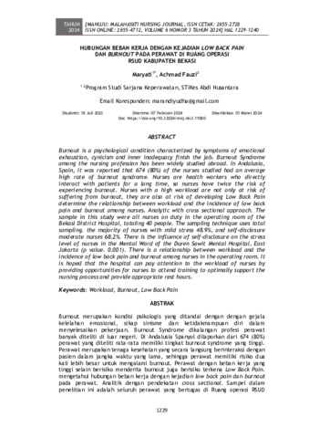 Maryati, Maryati and Achmad, Fauzi (2024) Hubungan beban kerja dengan kejadian low back pain dan burnout pada perawat di ruang operasi RSUD Kabupaten Bekasi. Manuju: Malahayati Nursing Journal, 6 (3): 32. pp. 1229-1240. ISSN 2655-2728