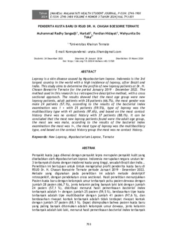 Muhammad, Radhy Sangadji and Hartati, Hartati and Ferdian, Hidayat and Wahyunita, Do Toka (2024) Penderita kusta baru di RSUD DR. H. Chasan Boesoirie Ternate. MAHESA : Malahayati Health Student Journal, 4 (3): 1. pp. 793-801. ISSN 2746-198X