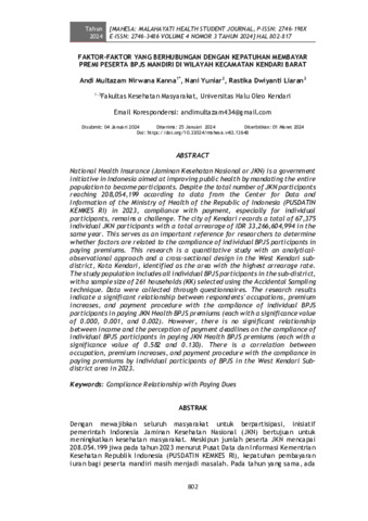 Andi, Multazam Nirwana Kanna and Nani, Yuniar and Rastika, Dwiyanti Liaran (2024) Faktor-faktor yang berhubungan dengan kepatuhan membayar premi peserta BPJS mandiri di wilayah Kecamatan Kendari Barat tahun 2023. MAHESA : Malahayati Health Student Journal, 4 (3): 2. pp. 802-817. ISSN 2746-198X