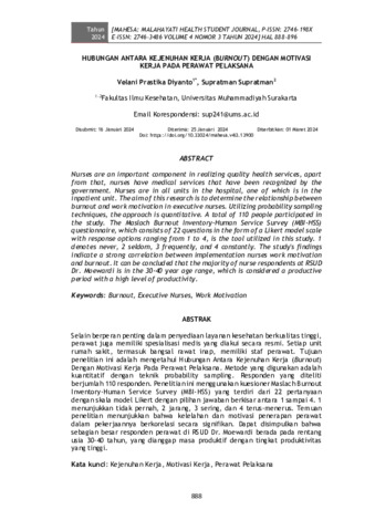 Velani, Prastika Diyanto and Supratman, Supratman (2024) Hubungan antara kejenuhan kerja (burnout) dengan motivasi kerja pada perawat pelaksana. MAHESA : Malahayati Health Student Journal, 4 (3): 10. pp. 888-896. ISSN 2746-198X