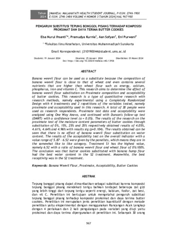 Elsa, Nurul Ihsanti and Pramudya, Kurnia and Aan, Sofyan and Eni, Purwani (2024) Pengaruh substitusi tepung bonggol pisang terhadap komposisi proksimat dan daya terima butter cookies. MAHESA : Malahayati Health Student Journal, 4 (3): 17. pp. 967-980. ISSN 2746-198X