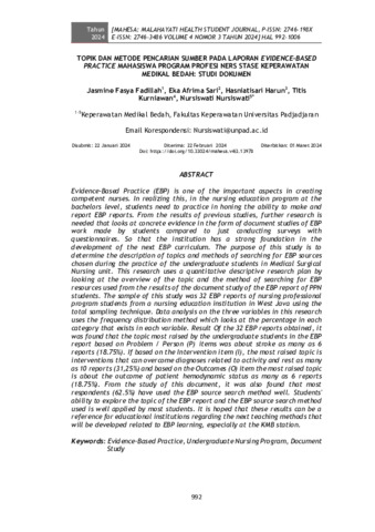 Jasmine, Fasya Fadillah and Eka, Afrima Sari and Hasniatisari, Harun and Titis, Kurniawan and Nursiswati, Nursiswati (2024) Topik dan metode pencarian sumber pada laporan evidence-based practice mahasiswa program profesi ners stase keperawatan medikal bedah: Studi dokumen. MAHESA: Malahayati Health Student Journal, 4 (3): 19. pp. 992-1006. ISSN 2746-198X