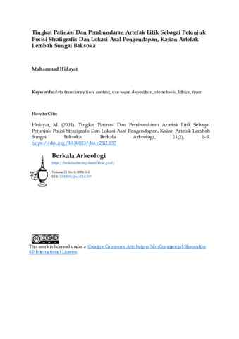 Muhammad, Hidayat (2001) Tingkat patinasi dan pembundaran artefak litik sebagai petunjuk posisi stratigrafis dan lokasi asal pengendapan: Kajian artefak Lembah Sungai Baksoka. Berkala Arkeologi, 21 (2). pp. 1-8. ISSN 0216 - 1419