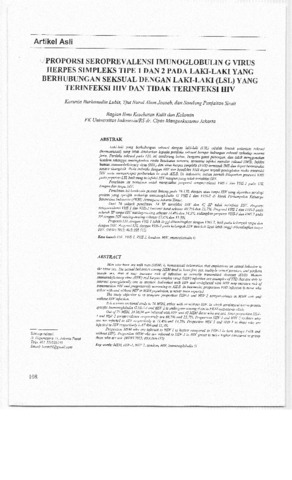 Karunia, Burhanudin Lubis and Tjut, Nurul Alam Jacoeb and Sondang, Panjaitan Sirait (2013) Proporsi seroprevalensi imunoglobulin G virus herpes simpleks tipe 1 dan 2 pada laki-laki yang berhubungan seksual dengan laki-laki (LSL) yang terinfeksi HIV dan tidak terinfeksi HIV. Media Dermato-Venerologica Indonesiana, 40 (3): 2. pp. 108-112. ISSN 0216-0773