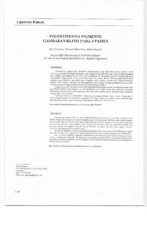 lnkontinensia pigmenti (IP) merupakan genodermatosis yang diturunkan secara dominan terkait kromsom X, bersifat letal dalam kandungan pada sebagian besar laki-laki yang terkena (X-linked dominant male lethality) dan ekspresinya bervariasi pada perempuan. IP merupakan penyakit sistemik yang dapat menyebabkan kelainan kulit, sistem saraf pusat, mata, dan sistem skeletal. Kelainan pada kulit tersusun mengikuti garis Blaschko, dan terdiri alas 4 stadium, yaitu stadium 1 berupa lesi vesikel/ vesikobulosa, stadium 2 lesi verukosa, stadium 3 lesi hiperpigmentasi dan stadium 4 berupa hipopigmentasi atau atrofi. Keempat stadium ini dapat terjadi berurutan atau saling tumpang tindih. Diagnosis pasti IP ditegakkan berdasarkan pemeriksaan molekular dengan ditemukannya mutasi pada gen NEMO (Nuclear factor kappa beta essential modulator) pada Xq28. Secara klinis diagnosis ditegakkan berdasarkan temuan lesi kulit khas pada bayi baru lahir yang mengikuti garis Blaschko dengan gambaran histopatologis sesuai stadium. Pada laporan kasus ini dilaporkan 4 orang bayi perempuan berusia 2 hari, 15 hari, 7 bulan dan 15 bulan yang didiagnosis IP berdasarkan gambaran klinis khas, dengan lesi kulit tersusun mengikuti garis Blaschko. Kasus 2 dan 4 disertai manifestasi ekstrakutan.