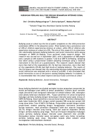 Dwi, Christina Rahayuningrum and Emira, Apriyeni and Helena, Patricia (2024) Hubungan perilaku bullying dengan kemampuan interaksi sosial pada remaja. MAHESA: Malahayati Health Student Journal, 4 (3): 22. pp. 1040-1050. ISSN 2746-198X