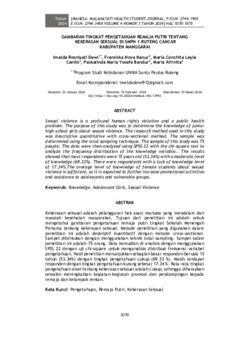 Imelda, Rosniyati Dewi and Fransiska, Nova Nanur and Maria, Conchita Leyla Centis and Paskalinda, Maria Yosefa Bandur and Maria, Afrinita (2024) Gambaran tingkat pengetahuan remaja putri tentang kekerasan seksual di SMPN 1 Ruteng Cancar Kabupaten Manggarai. MAHESA: Malahayati Health Student Journal, 4 (3): 25. pp. 1070-1078. ISSN 2746-198X