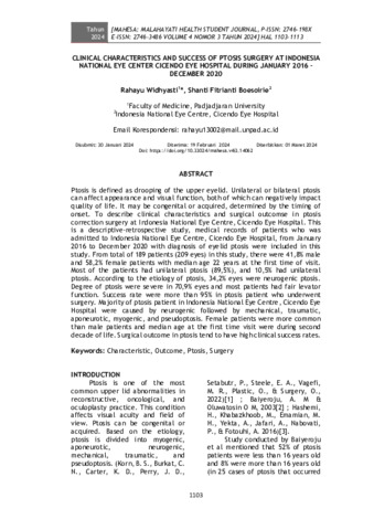 Rahayu, Widhyasti and Shanti, Fitrianti Boesoirie (2024) Clinical characteristics and success of ptosis surgery at Indonesia National Eye Center Cicendo Eye Hospital during January 2016 – December 2020. MAHESA: Malahayati Health Student Journal, 4 (3): 28. pp. 1103-1113. ISSN 2746-198X