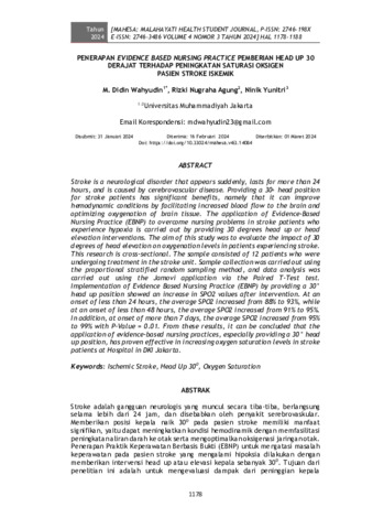 M., Didin Wahyudin and Rizki, Nugraha Agung and Ninik, Yunitri (2024) Penerapan evidence based nursing practice pemberian head up 30 derajat terhadap peningkatan saturasi oksigen pasien stroke iskemik. MAHESA: Malahayati Health Student Journal, 4 (3): 34. pp. 1178-1188. ISSN 2746-198X