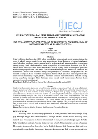 Asfiyah, Asfiyah (2023) Kelekatan siswa dan guru BK dalam pembentukan strategi coping pada boarding school. Islamic Education and Counseling Journal, 2 (2): 1. pp. 1-9. ISSN 2828-5905