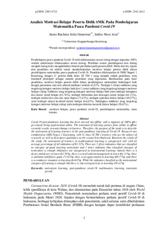 Sanie, Rachma Setia Gunawan and Indrie, Noor Aini (2023) Analisis motivasi belajar peserta didik SMK pada pembelajaran matematika pasca pandemi Covid-19. Gammath: Jurnal Ilmiah Program Studi Pendidikan Matematika, 8 (1): 1. pp. 1-9. ISSN 2503-4723