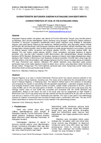 Deddy NSP, Tanggara and Wita, Kristiana (2023) Karakteristik batubara daerah Katanjung dan sekitarnya. JTP (Jurnal Teknik Pertambangan), 23 (2): 2. pp. 11-17. ISSN 2087-1058