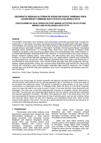 Wita, Kristiana and Deddy, NSP Tanggara (2023) Geowisata sebagai alternatif kegiatan pasca tambang pada lahan bekas tambang batu di Kota Palangka Raya. JTP (Jurnal Teknik Pertambangan), 23 (2): 3. pp. 18-24. ISSN 2087-1058