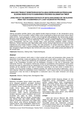 Ardo P., Situmorang and Revia, Oktaviani and Shalaho, Dina Devi and Agus, Winarno and Albert Juvensius, Pontus (2023) Analisis tingkat disintegrasi Batulanau berdasarkan pengujian slaking index di Kota Samarinda Provinsi Kalimantan Timur. JTP (Jurnal Teknik Pertambangan), 23 (2): 6. pp. 40-46. ISSN 2087-1058