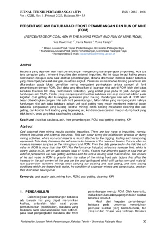 Yos David, Inso and Ferra, Murati and Yunie, Tampi (2023) Persentase ash batubara di front penambangan dan Run of Mine (ROM). JTP (Jurnal Teknik Pertambangan), 23 (1): 5. pp. 30-35. ISSN 2087-1058